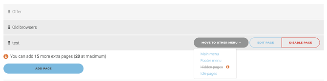 The new page created will be named for example userpage-05, the number representing the number of new pages that have been created. Hovering over the page entry will show options: - Move to other menu / Edit page/ Disable page.