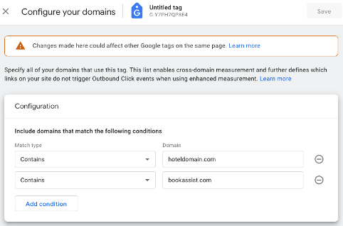 Now we are going to set up cross-domain tracking. First, click on Configure your domains and add the hotel domain and Bookassist domain, just the name and the prefix, without www. or https://