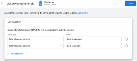 After that, click on List unwanted referrals, and follow same steps, add hotel domain and bookassist domain, example: