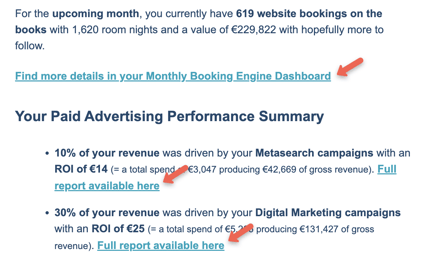We are introducing a single monthly email showing the performance of your Booking Engine as well as Digital Marketing and Metasearch initiatives.