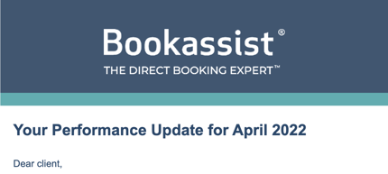 The email contains a set of KPIs on Booking Engine and Paid Advertising Performance for the previous month and links to find detailed reports on our Bookassist Intelligence platform.