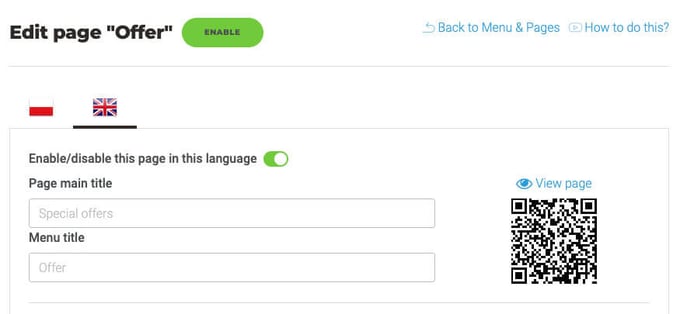 Enable the page (green button) and Save the page to begin, then View page (above QR code).