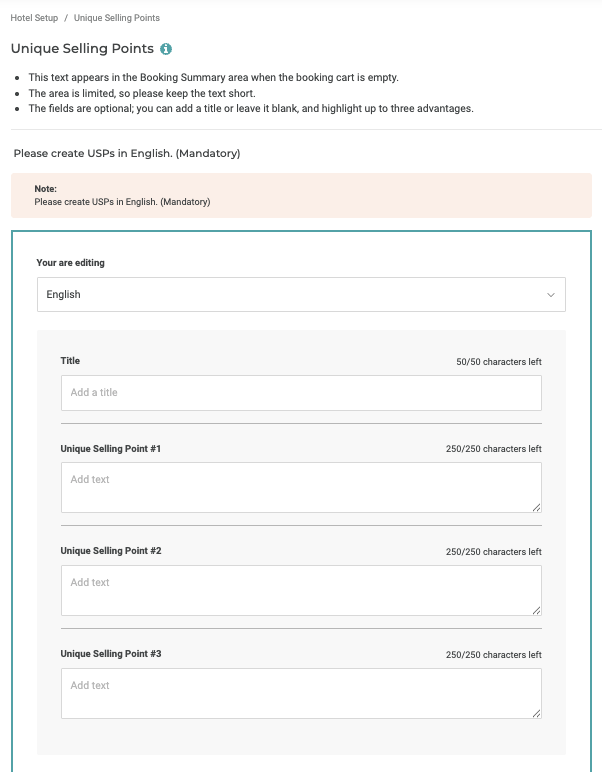 This tab will take you to the new USP page where you will be able to create a unique title for all the USPs and up to 3 USPs in all the available languages your hotel has in the Booking Platform.