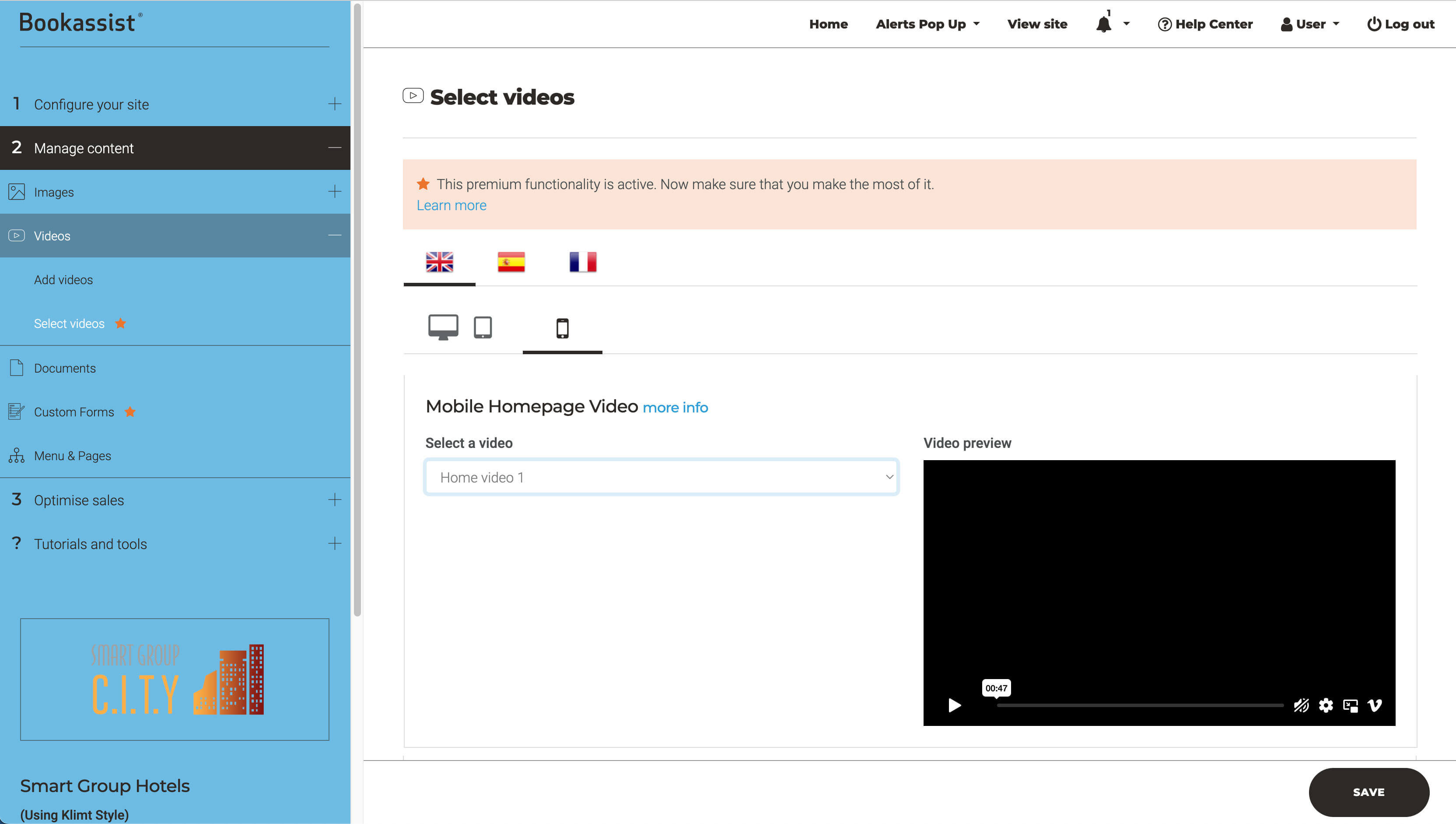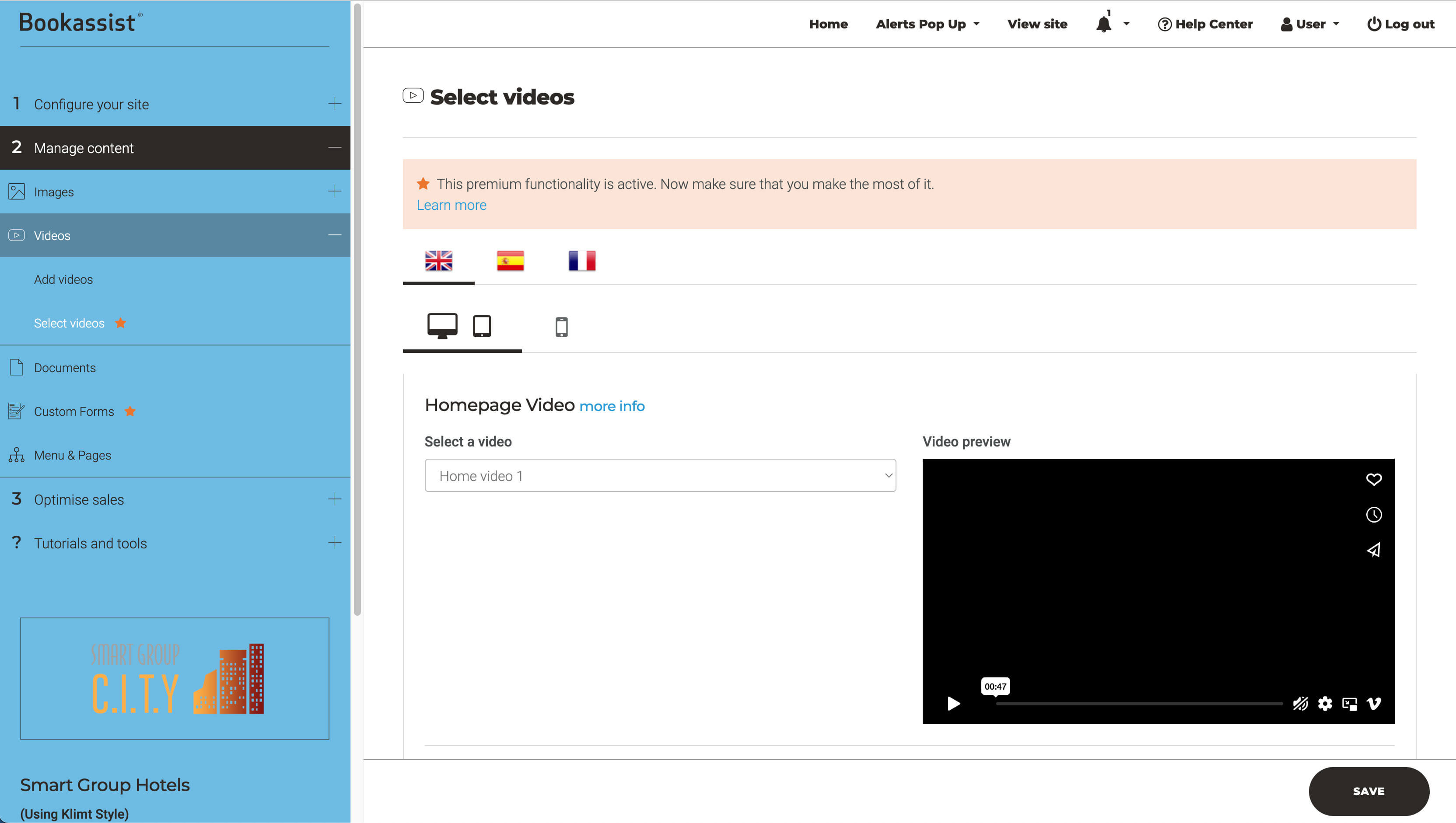 Here you will be able to select the video already added, to be displayed on the homepage or below in the secondary video position as a section in the content of the page.