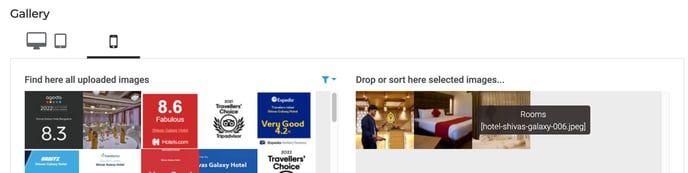 Pasa el cursor sobre las miniaturas de las imágenes seleccionadas a la derecha para ver la información de los datos de la imagen que se encuentra en la descripción emergente. Aquí vemos el título de la leyenda: Habitaciones y el nombre de la imagen: hotel-dhivas-galaxy-006.jpeg.
