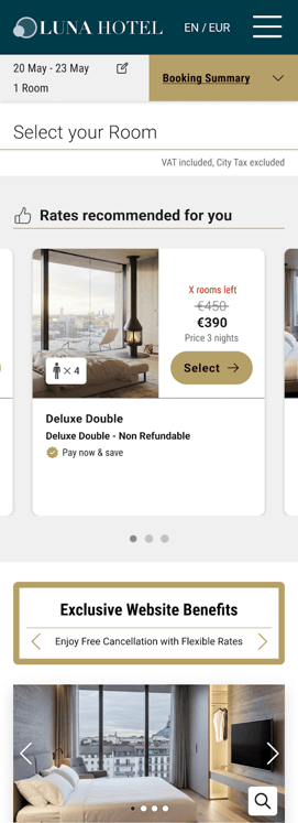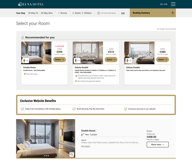 - Página de selección de habitaciones: Situado justo debajo del Rate Recommender