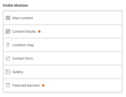 Étant donné que ce site utilise le thème Klimt, il est essentiel que les modules pour le 'Contenu principal', la 'Carte de localisation', le 'Formulaire de contact' et la 'Galerie' soient bien visibles.