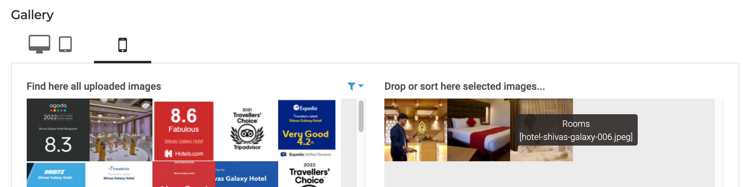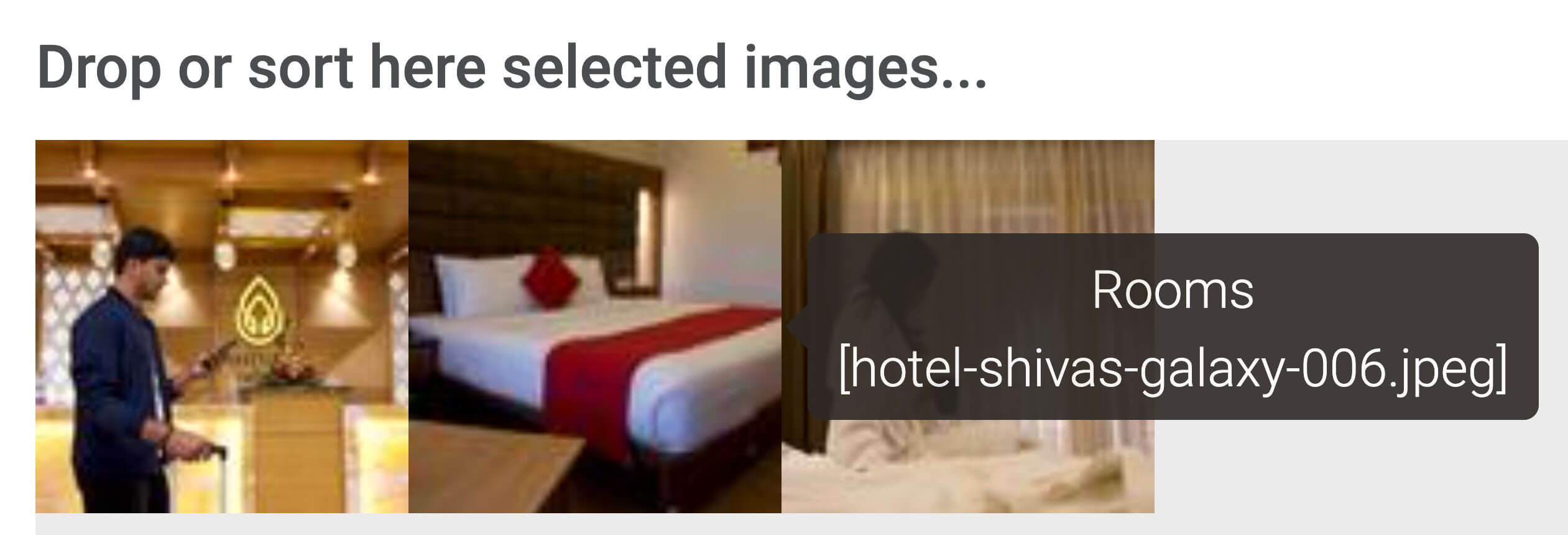 Passa sopra le miniature delle immagini selezionate sulla destra per visualizzare le dati dell'immagine contenuti nel tooltip. Qui vediamo il titolo della didascalia: Camere e il nome dell'immagine: hotel-dhivas-galaxy-006.jpeg. hotel-dhivas-galaxy-006.jpeg.
